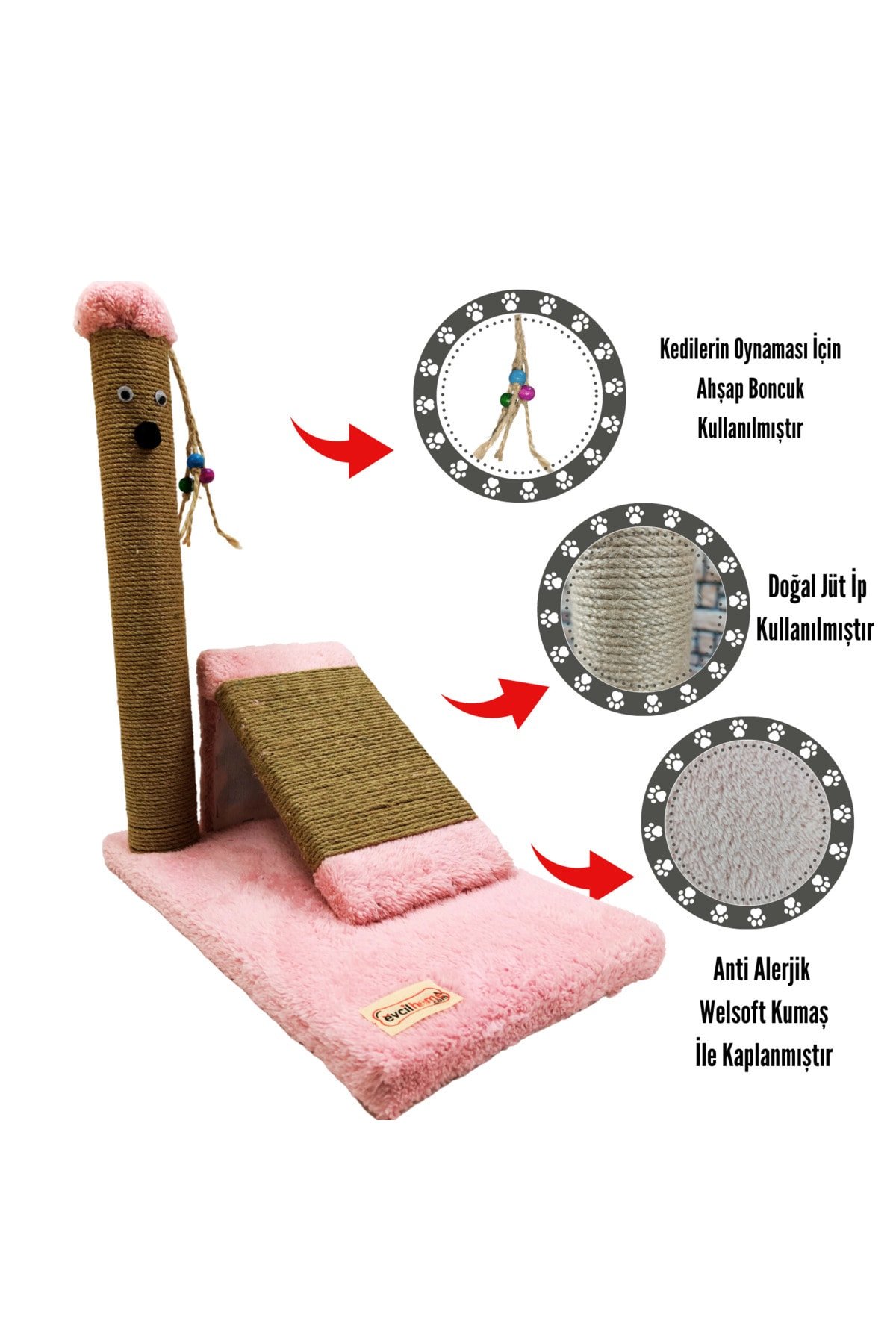 Evcil Home Kedi Tırmalama Sütunu ürünümüz kedilerinizin vazgeçilmezleri olan tırmalama, oyun ve barınma ihtiyaçlarını karşılamak üzere tasarlanmıştır ; Her yaşta kedi rahatlıkla kullanabilir. ; Dostlarımızın sağlığı düşünülerek polyester veya kimyevi madde içermeyen %100 doğal kendir halat kullanılmıştır. ; Kullandığımız hammaddeler yerli üretim ve doğal olup kalitesiz ithal ürünler kullanılmamaktadır. ; Ahşap gövde üzerine welsoft kumaş kaplanmıştır. ; Welsoft kumaş üzerine doğal ve dayanıklı jüt halat sarılmıştır. ; Bulunduğunuz alanlardaki eşyalara zarar vermemesi için üretmiş olduğumuz ürünlerin tabanları kaplıdır. ; %100 müşteri memnuniyeti garantilidir ; Üretmiş olduğumuz ürünlerimiz extra hijyenik bir şekilde sizlere ulaşması için özenle paketlenmiştir. ; Fırça renkleri değişiklik gösterebilmekte olup soru cevap kısmından dilediğiniz rengi ekletebilir, ürün üzerinden dilediğiniz değişikliği talep edebilirsiniz. ; Ürünümüz demonte değildir.(SADECE TIRMALAMA SÜTUNU KURULU DEĞİLDİR). ; Ürünümüz yetişkin ve yavru kedilerinizin tırmalama ihtiyaçlarını karşılayacak biçimde tasarlanmış, ; Farklı renkleri mevcuttur. ; Ürünlerimiz Kedinizin tüm enerjik ihtiyaçlarını karşılaması ve eviniz için dekoratif olarak da kullanabileceğiniz bir üründür. Kediler doğada çok fazla tırmandıkları için tırnakları bu tırmalamalar esnasında törpülenerek hem kısalır hem de sivrileşir. Mobilyaların zarar görmemesi için rahatlıkla tırmalayabilecekleri oyun alanlarına ihtiyaçları vardır. Kediler için tırmalama, yatak ve yuvalar üreten yerli butik fabrikamızda, en iyi Hammaddeler seçilerek özenle üretilir. Farklı mağazalarda olduğu gibi parça malzemeler kullanmamaktayız. ; Dostlarımızın sağlığına önem verdiğimiz için birinci sınıf ,yerli üretim ve doğal ürünleri birinci sınıf işçilik ile sizlere sunuyoruz. ; WELSOFT KUMAŞ – özelliğe sahiptir. Nefes alır. – Sıcak tutar. – Rahat ve yumuşak bir dokuya sahiptir. -Leke tutmaz ve kolayca silinebilir.. *Üretmiş olduğumuz ürünlerimizin gönderimini yaparken sağlam, temiz ve dikkatli biçimde paketlemekteyiz *Üretmiş olduğumuz tüm ürünlerimizi öncelikle kendimiz montajlamaktayız daha sonra paketleyerek sizlere göndermekteyiz ; Ürün Ölçüleri: ; Taban ölçüsü : 45X30 cm ; Yüksekliği :50cm ; Rampa Yüksekliği: 22 cm ; Rampa Uzunluğu: 32 cm ; Rampa Genişliği: 22 cm ; Ağırlığı 3,9 kg ; Evcil Home kedi tırmalama rampası canlı dostlarımız için özel olarak tasarlanmıştır. ; Evcil Home firmasından alacağınız her ürün için canlı dostumuzun ihtiyacına yönelik bir hediye gönderimi sağlanmaktadır. ; Evcil Home firmasından alacağınız tüm ürünler adınıza fatura kesilerek gönderilmektedir. ; ;