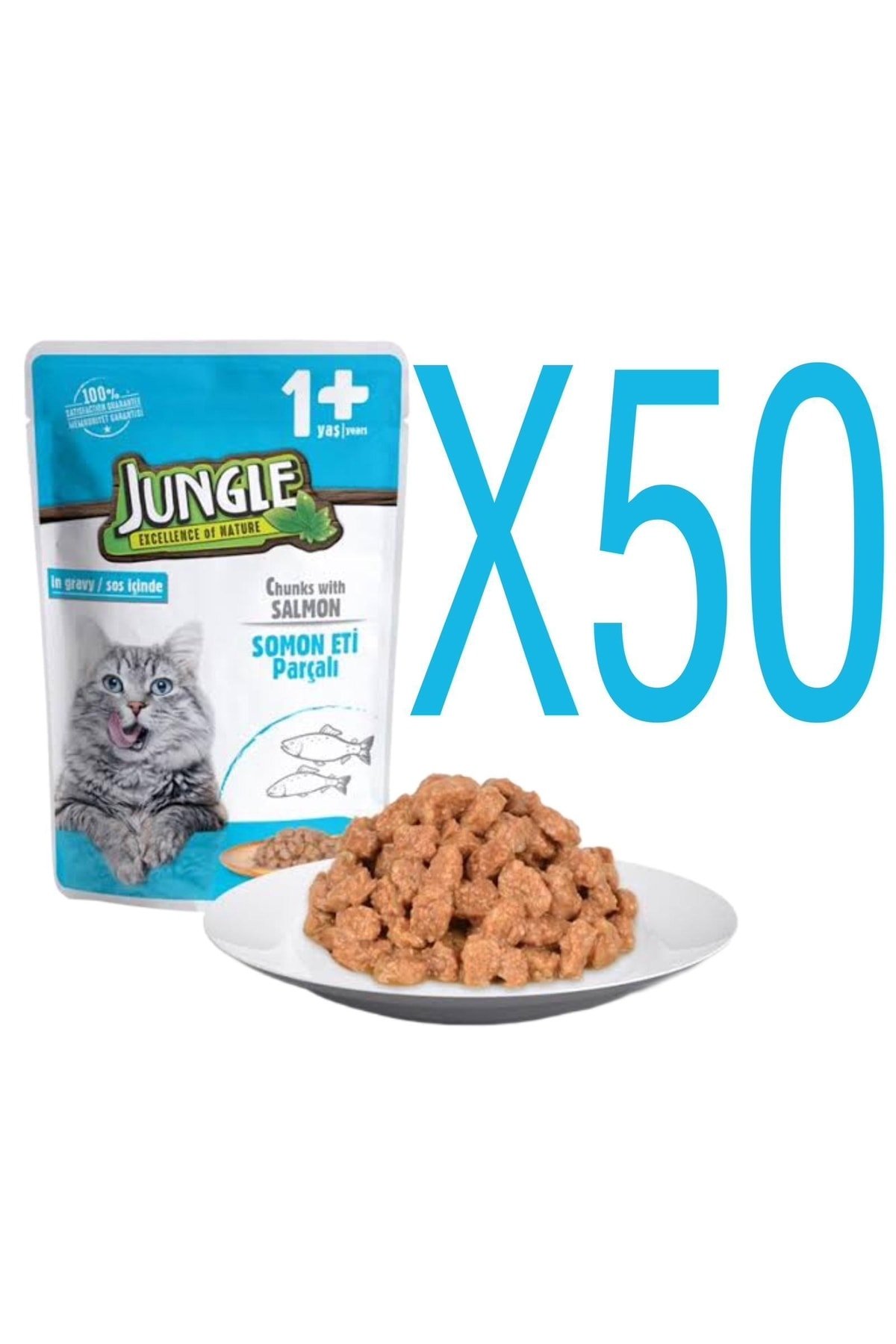Jungle Pouch Kedi Somonlu 50 Ad.Jelli Yaş Mama 100 gr. Karşı konulmaz lezzete ve kaliteli zengin içeriğe sahiptir. ; Tüm ırklardan yetişkin kedilerin tüketebileceği, soslu somon balıklı yaş kedi maması. ; İçerisinde bulunan vitamin ve mineraller diş ve kemik sağlığına katkıda bulunur. ; Kalp ve göz sağlığı için taurin kullanılmıştır. ; Dostlarınızın parlak ve canlı tüylere sahip olmasına destek olan bakır ve çinko içerir. ; Uzman veteriner hekimler ile birlikte geliştirilmiştir. ; Kullanım ve Günlük Besleme Miktarı: Dostlarınıza oda sıcaklığında veriniz. ; 3 ile 5 kg arasındaki yetişkin kedi için en az 2 öğünde günlük 2,5 ila 4 poşet veriniz. ; Buzdolabında saklayınız. ; Açıldıktan sonra 48 saat içerisinde tüketiniz. ; Bileşimi: Et ve hayvansal türev ürünleri ; Balık ve balık türevleri (minimum % 4 somon dahil), ; Bitkisel protein özleri, ; Bitkisel kökenli türev ürünler, ; Mineraller, ; Çeşitli şekerler. ; Analitik Bileşenler: Ham Protein % 8.0, ; Ham lif: % 0.8, ; Yağ içeriği: % 4.5, ; Ham kül % 2.0, ; Nem: % 83 ; Teknolojik Katkı maddesi: Sinameki sakızı : 2135 mg ; Besinsel Katkı Maddeleri: Vitamin D3: 142 IU (Diş ve Kemikler), ; Vitamin E : 28 Mg (Hücresel Koruma), ; Vitamin B1: 2.19 Mg (Enerji), ; Taurin: 206.6 Mg (Görme ve Kalp İşlevi), ; Bakır (E4) 0.54 Mg (Cilt, Post), ; Manganese (E5): 1.69 Mg (Diş ve Kemikler), ; Çinko (E6): 14.29 Mg (Cilt), ; İyot (E2): 0.14 Mg (Enerji) ; 1 Kolide 50 Adet 100 gr. Pouch Vardır. (Fiyat 1 Koli Fiyatıdır.) ;