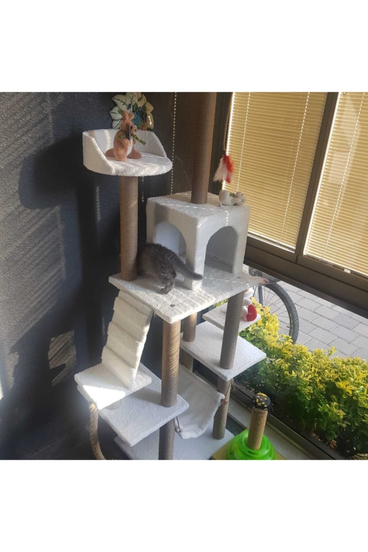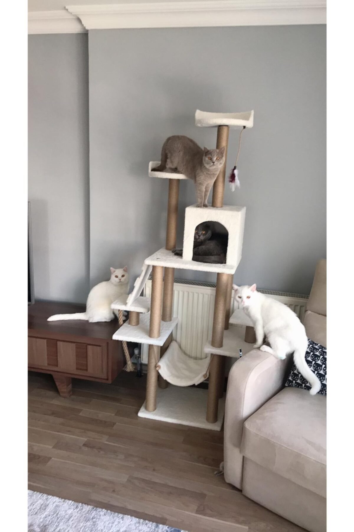 çok katlı yuvalı kedi tırmalama ve oyun platformu Kediler için eğlenceli bir oyun platformudur Yetişkin ve yavru kedileriniz için özel olarak üretilmiştir.Yetişkin ve yavru kedilerinizin kendilerine ait özel oyun alanlarına sahip olabilmesine olanak sağlar. Örme keten halat özelliğinden dolayı dayanıklıdır, kediler için, tırmanma, tırmalama, gerilme ve yuva ihtiyaçlarını aynı anda karşılamak amacıyla özel olarak tasarlanmış, sisal tırmalama kolonları, welsoft peluş kaplı yuvası bulunan tırmalama setidir. Tüm yaş kediler için uygun, her tarafı peluş kaplı, tüm taşıyıcı dikmeleri tırmalama silindiri olan, tamamen demontable, ekstra sağlam, üzerinde birçok katı, balkonu, kapılı kedi evi ve oyuncak takılabilen elastik ipleri bulunan, uyuma-Uzanma alanları ile muhteşem kedi kulesidir Kolay temizlenebilen welsoft kumaş kaplı tablalardan oluşmaktadır ; Taban ölçüsü : 40×50 cm ; Yüksekliği :180 cm ;